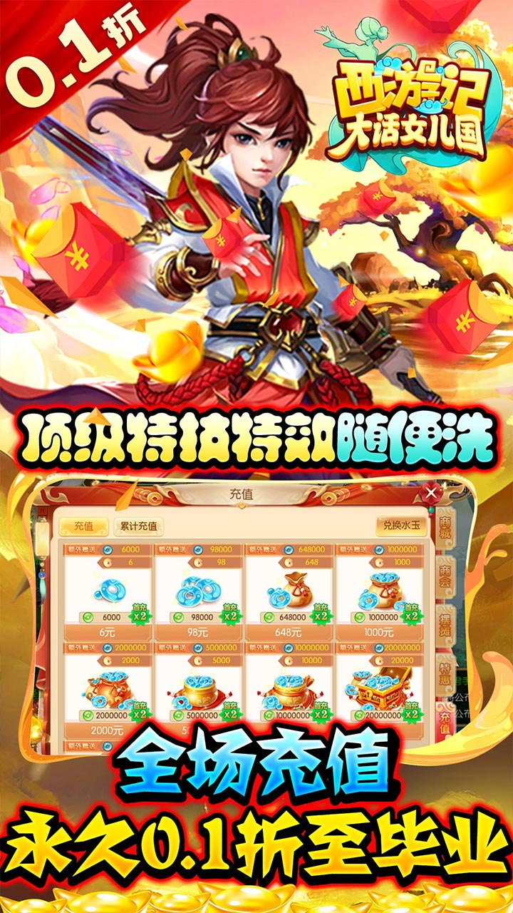 西游记大话女儿国0.1折扣版是一款专为回合爱好者定制的回合手游,战斗机制、经典玩法都能带给你最原汁原味的经典回合制游戏体验。上线就送各种珍贵道具!游戏在保留经典回合玩法的基础上,突破传统模式,爽快升级、激情跨服PK、极品装备全靠打、5宝宝上阵独此一家。百变个性时装、称号、坐骑、法宝等外显效果,打怪泡妹两不误!还请各位大侠进来一试,梦回大唐盛世,游历三界奇缘,享最纯粹的经典回合手游!