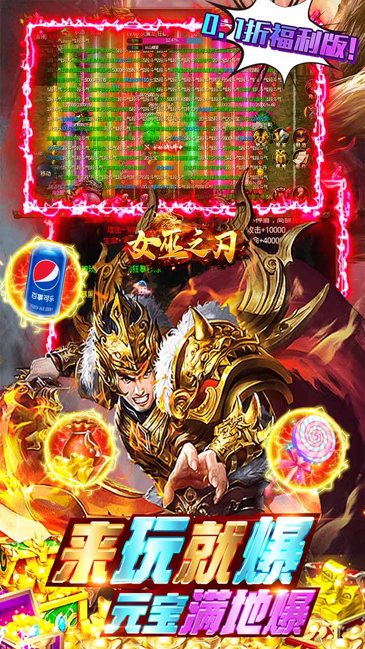 游戏中会有多种精彩活动,海量福利等你来领取。全场充值永久终生0.1折,元宝满地随便爆,回收装备送元宝、废弃装备回收激活特殊稀有属性。